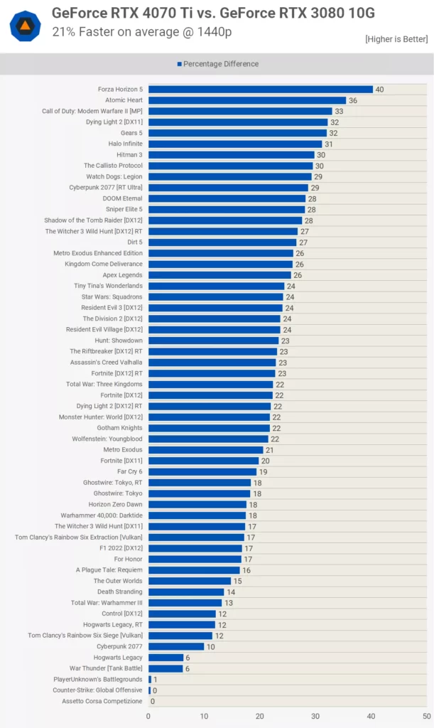 GeForce RTX 4070 Ti به طور متوسط ۲۱٪ سریعتر از RTX 3080 10GB در 1440p است، که یک ارتقاء قابل توجه به حساب میاد.
