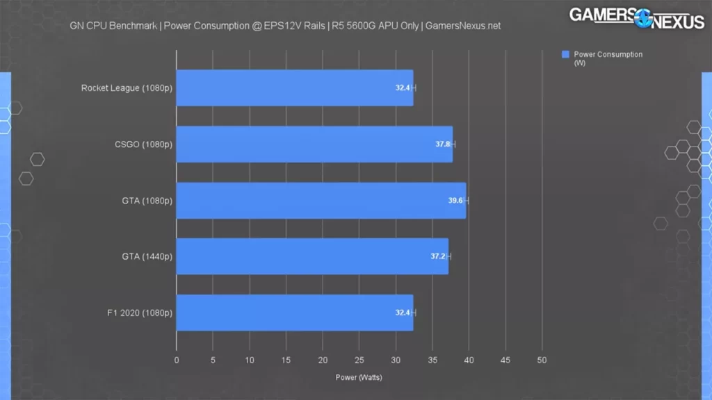 حالا سراغ میزان مصرف برق پردازنده هنگام استفاده از گرافیک آنبرد می‌ریم. در این تست‌ها، پردازنده از تمام توانش استفاده نمی‌کنه، اما پردازنده گرافیکی روی نهایت توانشه. همونطور که می‌بینید، در بازی‌های مختلف میزان مصرف برق بین ۳۲ و ۴۰ وات متغیره، که ۳۰ وات کمتر از تمام توان مصرفی پردازنده‌ست. این به این دلیله که در تمام بازی‌ها، پردازنده Ryzen 5600G توسط پردازنده گرافیکی Vega 7 باتلنک میشه، و در نتیجه نمی‌تونه تمام توانش رو به نمایش بذاره.
