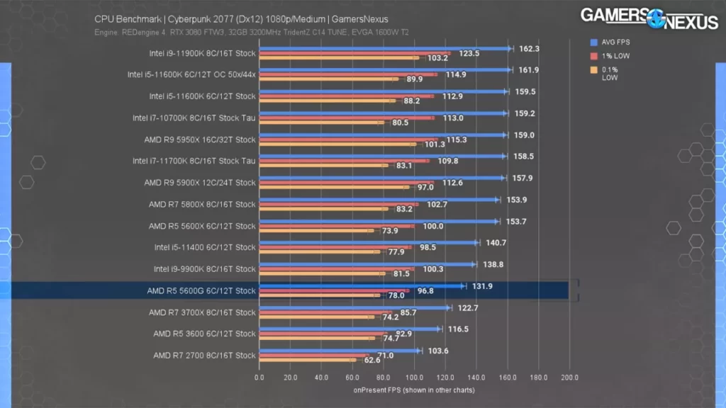 در سایبرپانک پردازنده Ryzen 5 5600G تونسته ۱۳۲ فریم بر ثانیه به نمایش بذاره، ۷% بیشتر از 3700X و ۶% کمتر از ۱۱۴۰۰. برتری 5600X اینجا به حدود ۱۷% رسیده، که با بقیه پردازنده‌های بالارده این لیست برابره و همه به محدودیت کارت گرافیک بر خوردن.