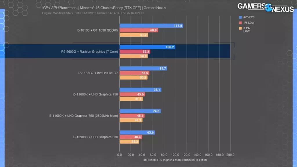 برای تست Minecraft از تنظیمات گرافیکی Fancy با رندر ۱۶ چانک استفاده شده، و اینجا هم Ryzen 5 5600G از ترکیب i3 10100 و GT 1030 شکست خورده. البته با این تنظیمات حتی گرافیک آنبرد UHD 630 هم تونسته بیش از ۶۰ فریم ارائه بده، اما Ryzen 5 5600G هد روم بیشتری در اختیار شما می‌ذاره.
