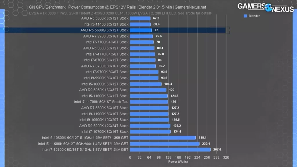 مصرف برق پردازنده‌های پایین‌رده اهمیت چندانی نداره، اما به شما در انتخاب کولر و پاور مناسب کمک می‌کنه. پردازنده Ryzen 5 5600g اینجا ۷۲ وات برق مصرف کرده، منتها چون گیمرز نکسوس از مادربردهای مختلفی برای پردازنده‌ها استفاده کرده، نمیشه مصرف اونو با Ryzen 5 5600X مقایسه کرد. همچنین اینجا گرافیک آنبرد استفاده نمی‌شده، پس تاثیرش روی مصرف برق مشخص نیست.