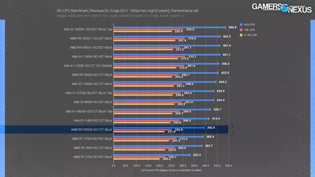 در رزولوشن 1080p می‌بینیم که پردازنده Ryzen 5 5600G تونسته ۳۹۳ فریم بر ثانیه رو نمایش بده، تقریبا برابر با Ryzen 7 3700X و ۱۵% ضعیف‌تر از Ryzen 5 5600X بوده. بازی Rainbow Six Siege بیشتر از فرکانس بالا استفاده می‌کنه تا هر چیز دیگه، به خاطر همین فرکانس بالاتر 5600X کمک بیشتری بهش کرده. همچنین عملکرد Ryzen 5 5600G پیشرفت زیادی نسبت به Ryzen 5 3600 نداره، و اگه تونستید این پردازنده رو با قیمت پایین‌تر پیدا کنید و نیازی به گرافیک آنبرد اون نداشتید، انتخاب بهتری به حساب میاد.