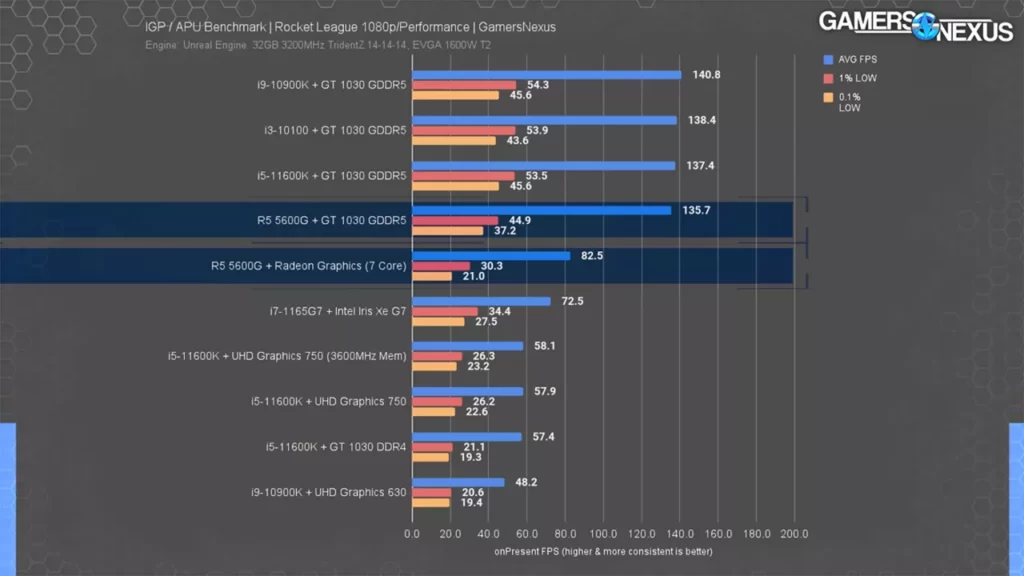 در بازی Rocket League فقط Performance mode تست شده، و Ryzen 5 5600G تونسته ۸۲ فریم ارائه داده بده، در حالیکه استفاده از گرافیک GT 1030 مصرف رو ۶۰% روی تمام پردازنده‌ها ارتقا داده. این نشون میده در این عنوان به راحتی به محدودیت گرافیک برمی‌خوریم، اما همچنان گرافیک آنبرد AMD عملکرد خیلی بهتری نسبت به گرافیک آنبرد اینتل ثبت کرده.