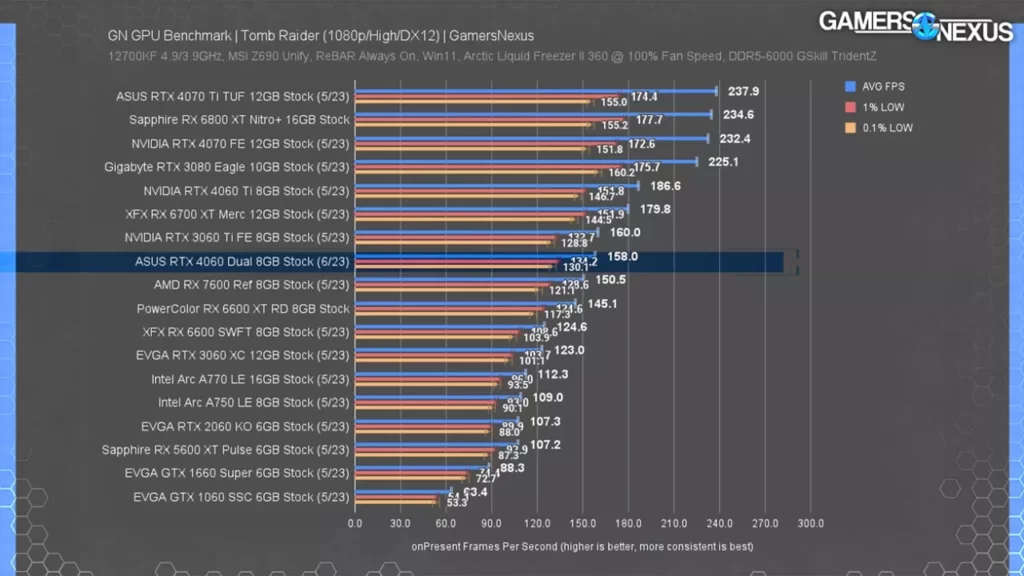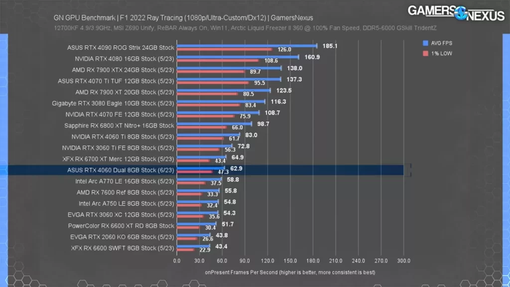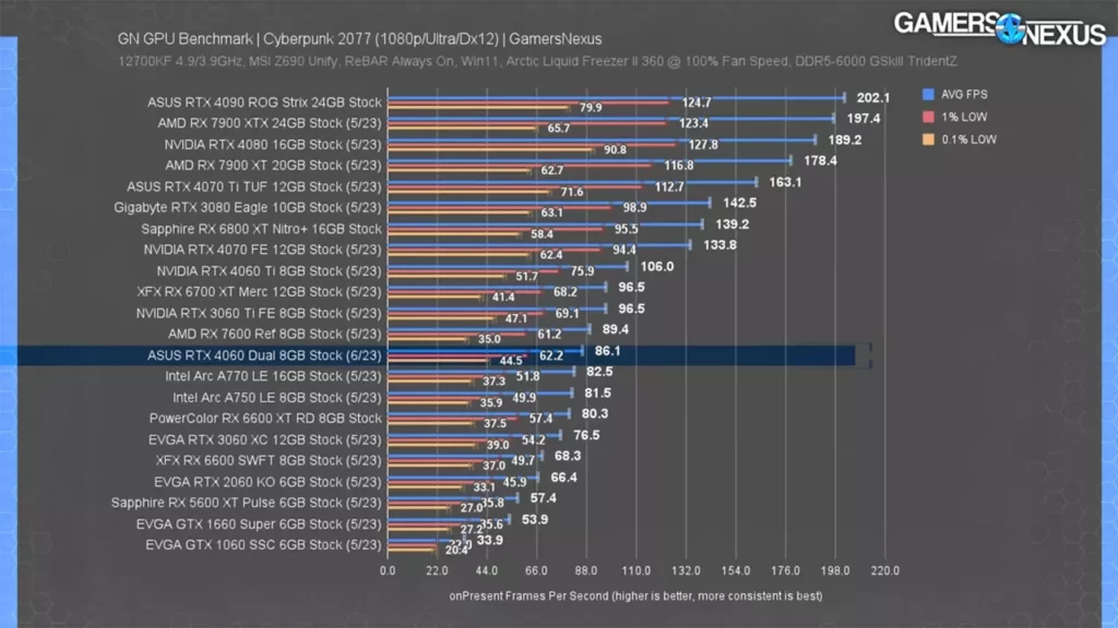 کارت گرافیک RTX 4060، با RX 7600 و Arc A770 تقریبا برابر بوده، و تفاوت فاحشی بین اونها دیده نمیشه.