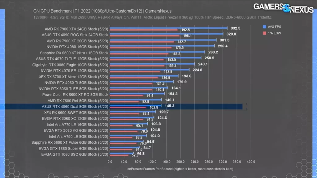 در بازی F1 2022، کارت گرافیک RTX 4060 تونسته ۱۴۵ فریم بر ثانیه به نمایش بذاره، که آمار خوبی برای یه کارت گرافیک میانرده محسوب میشه. این کارت تونسته ۱۶% قویتر از RTX 3060 عمل کنه، که پیشرفت خوبیه، اما همچنان چشمگیر نیست، و این کارت از RTX 3060 Ti شکست میخوره. RX 7600 با RTX 4060 از نظر میانگین FPS برابر بوده، اما حداقل فریمهای خیلی ضعیفتری رو ثبت کرده. RX 6600 XT از نسل پیش عملکرد بهتری از هر دوی اونها داره.