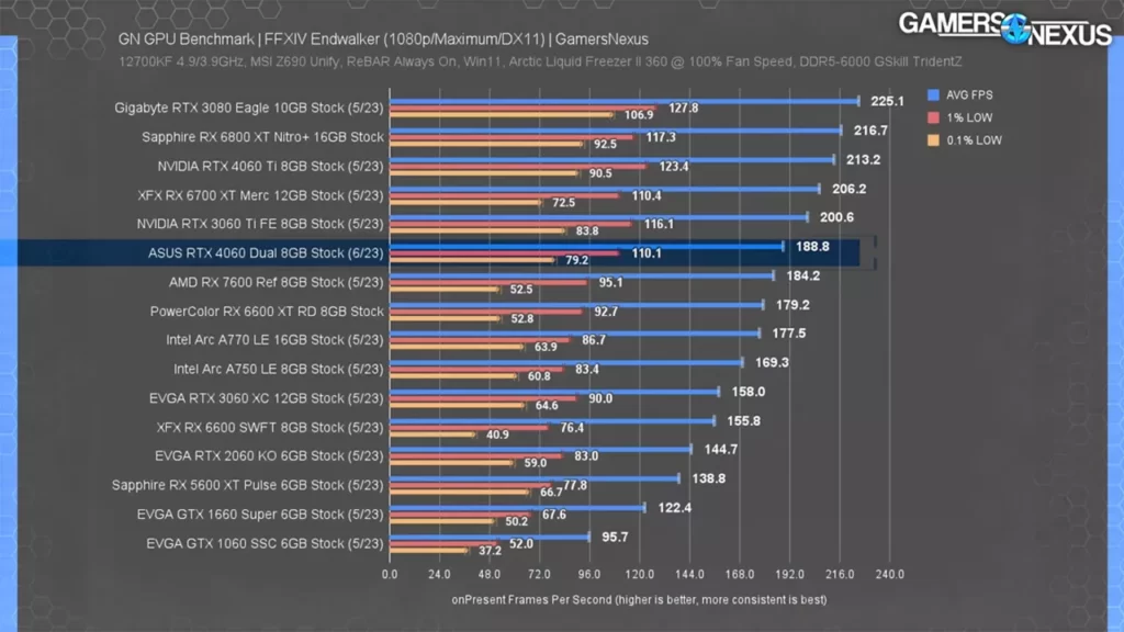 در بازی Final Fantasy XIV شاهد آمار بهتری هستیم. اینجا کارت گرافیک RTX 4060 تنها ۵% ضعیفتر از RTX 3060 Ti بوده، و با برتری ۱۹ درصدی RTX 3060 رو شکست داده. این عنوان در DX 11 اجرا میشه، و ممکنه این اتفاق دلیل عملکرد بهتر این کارت گرافیک باشه.