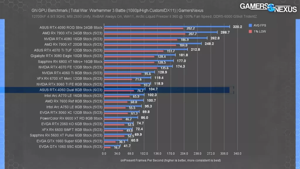 بازی Total War: Warhammer 3 عنوان سنگینی برای کارت گرافیکه، به خاطر همین تفاوتها رو به خوبی نشون میده. در این بازی، کارت گرافیک RTX 4060 موفق به نمایش ۱۰۵ فریم بر ثانیه شده، که باز هم از RTX 3060 Ti شکست میخوره، و برتری ۱۶ درصدی رو در برابر RTX 3060 به نمایش میذاره.