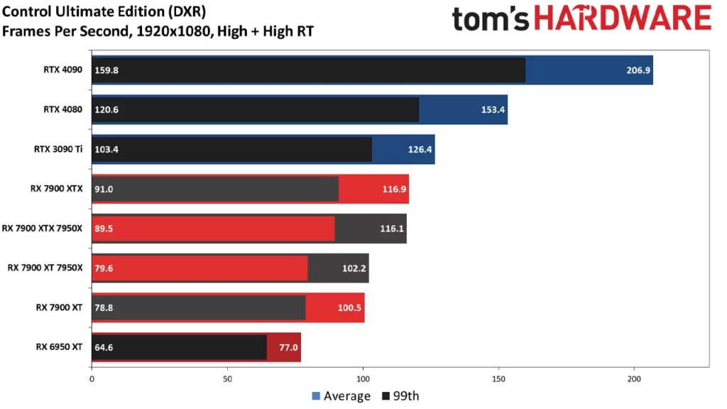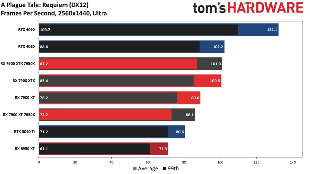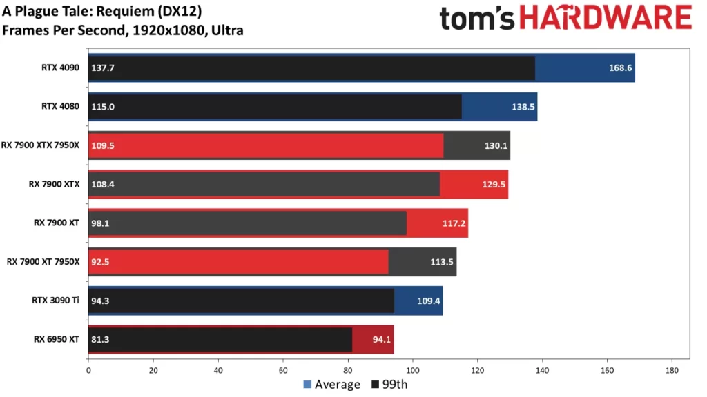 در این بازی، به راحتی میتونید قدرت گرافیکی بالاتر RTX 4090 رو ببینید. درحالیکه RTX 4080 و RX 7900 XTX هر دو عملکرد یکسانی رو ارائه دادن، RTX 4090 تونسته با برتری ۳۲ درصدی هر دوی اونها رو شکست بده. برتری نسبت به RTX 3090 Ti هم کاهش پیدا کرده، و به ۴۰% رسیده.