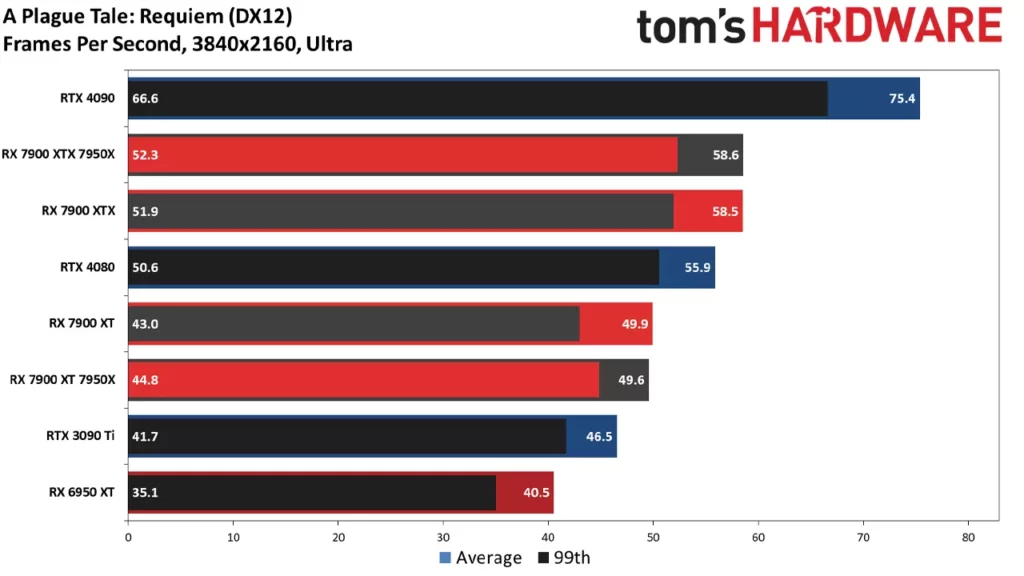 در مقایسه با RTX 4080، شاهد تفاوت ۲۴ درصدی عملکرد این کارت و RTX 4090 هستیم. RTX 3090 Ti هم با ۷۹ فریم بر ثانیه، پشت سر RX 6950XT و ۶۲% ضعیفتر از RTX 4090 بوده.