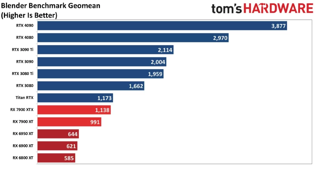 بنچمارک Blender یه تست سه بعدیه، و از هستههای ریتریسینگ برای رندر استفاده میکنه، منتها روی کارت گرافیکهای AMD و اینتل انگار از هستههای ریتریسینگ استفاده نمیکنه و شیدرهای کارت گرافیک رو مجبور به رندر ریتریسینگ میکنه، برای همین هیچکدوم از کارتهای AMD عملکرد خوبی رو ارائه ندادن، اما نتایج انویدیا درسته.
