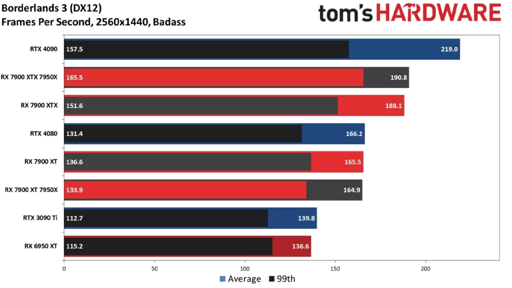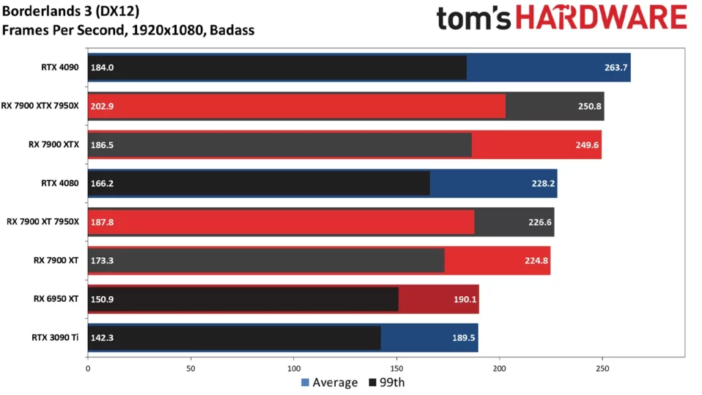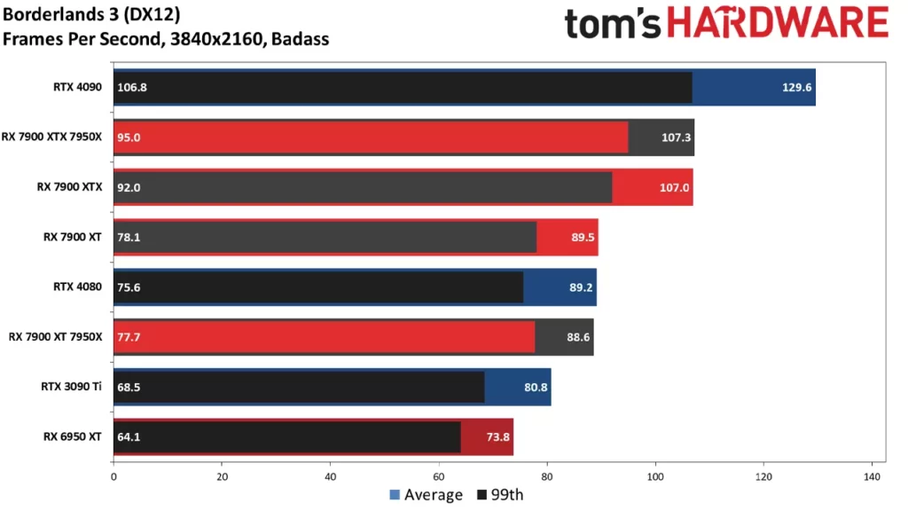 در Borderlands 3 هم نتایجی شبیه به تست قبلی رو میبینیم. کارت گرافیک RTX 4090 تونسته ۱۳۰ فریم بر ثانیه ارائه بده، که برتری ۲۱% نسبت به RX 7900 XTX داشته. آمار RTX 4080 هم جالبه. در این تست این کارت ۸۹ فریم بر ثانیه به نمایش گذاشته، که ۴۴% ضعیفتر از RTX 4090 بوده، و همچنین ۲۰% ضعیفتر از RX 7900 XTX. برتری نسبت به نسل قبل در این عنوان هم نمایانه، و RTX 3090 Ti حدود ۶۰% ضعیفتر بوده.