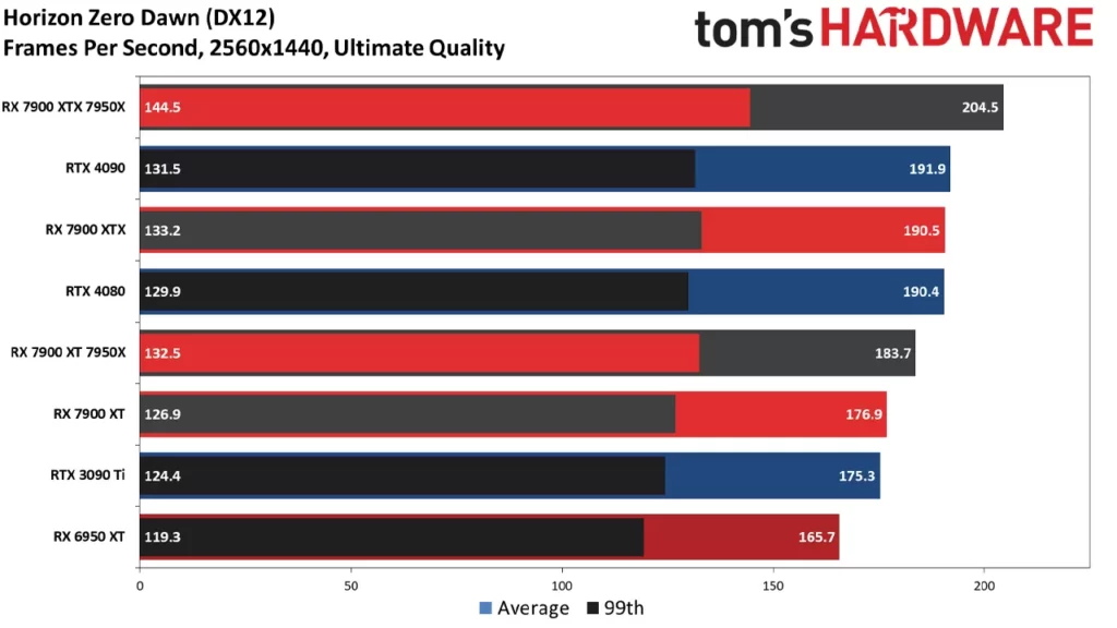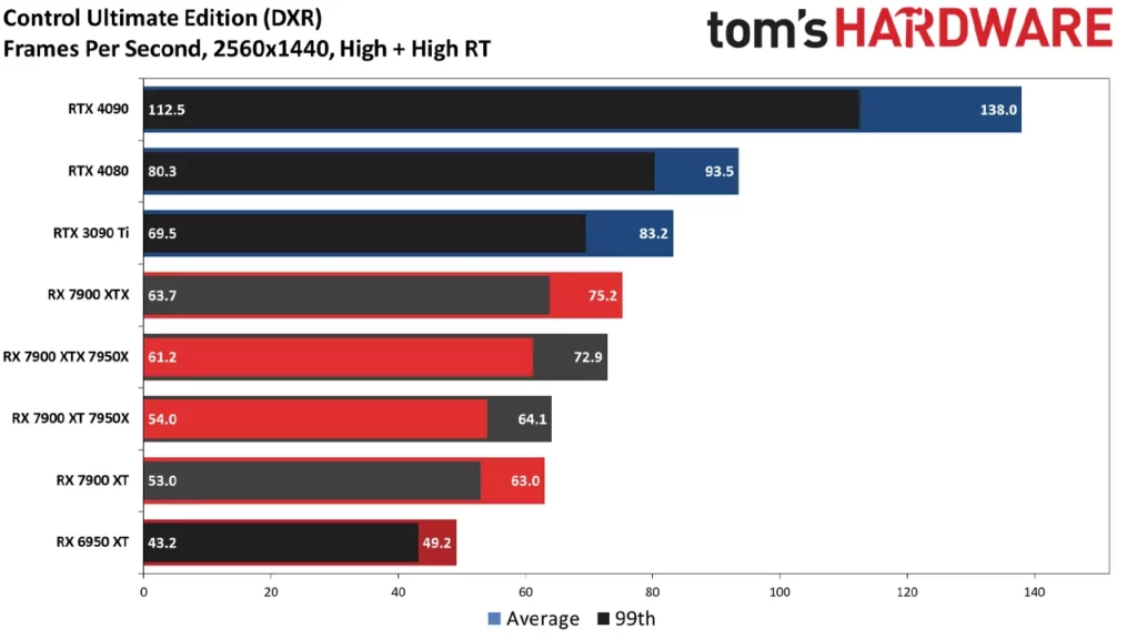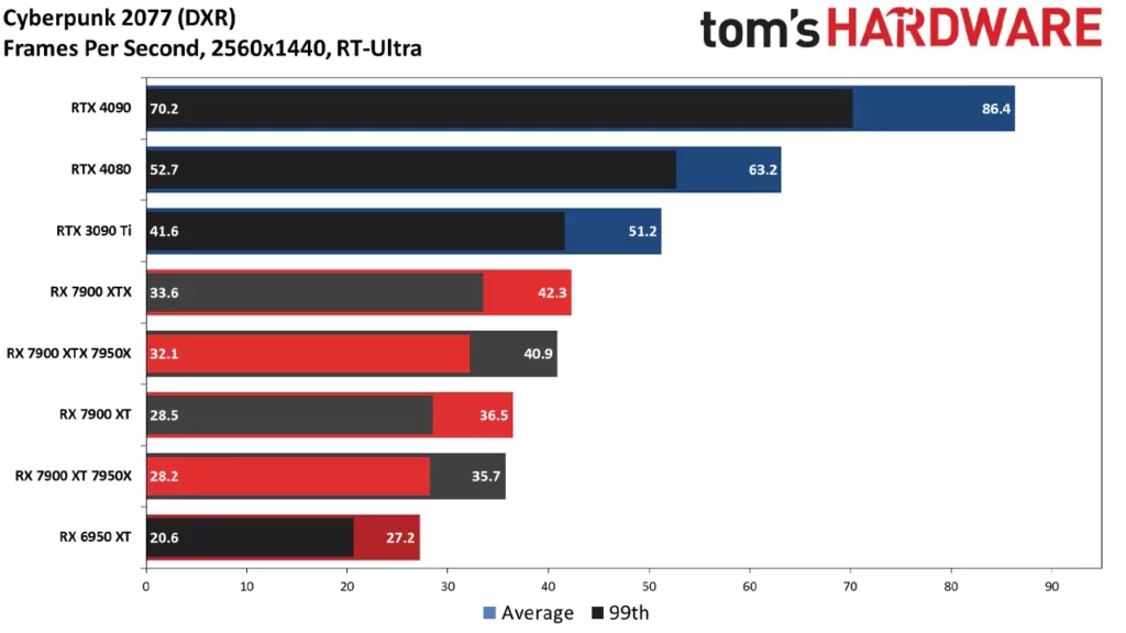 در رزولوشن 1440p، کارت گرافیک RTX 4090 برتریش رو از دست میده و RX 7900 XTX جاشو میگیره، البته در صورتی که برای این کارت گرافیک از پردازنده R9 7950X استفاده کنید. در صورتی که از این کانفیگ استفاده کنید، میتونید از SAM یا Smart Access Memory استفاده کنید که میتونه عملکرد کارت گرافیک رو مقداری بهتر کنه، که در اینجا این مقدار کم باعث پیشرفت ۶ درصدی عملکرد شده، و باعث شده این کارت گرافیک هم در میانگین فریم ریت و هم در حداقل فریم ریت RTX 4090 رو شکست بده. البته این شکست RTX 4090 همونطور که میبینید به خاطر محدودیت پردازندهست، و این همکاری قطعات AMD با همه که باعث شده این برتری به وجود بیاد.