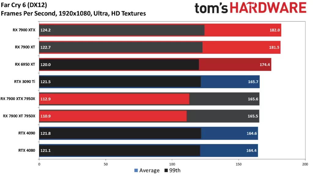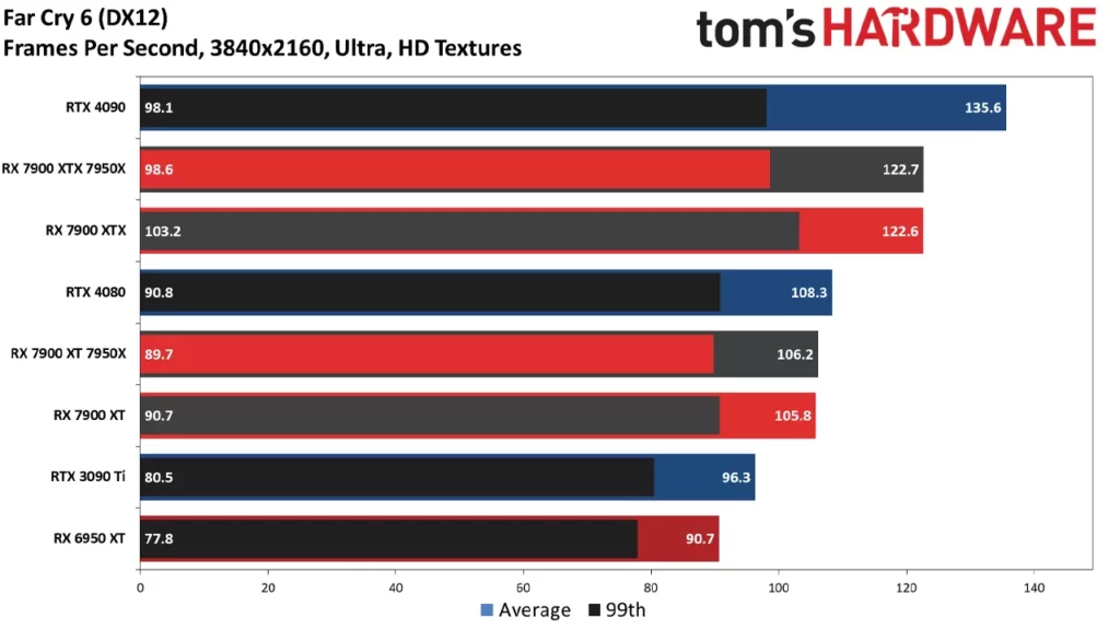 در بازی Far Cry 6 برتری کارت گرافیک RTX 4090 کمتر از همیشه میشه، با تنها ۱۰% برتری نسبت به RX 7900 XTX و ۲۵% نسبت به RTX 4080. این کاهش برتری نسبت به نسل قبل هم مشهوده، و فاصله با RTX 3090 Ti به ۴۰% رسیده.