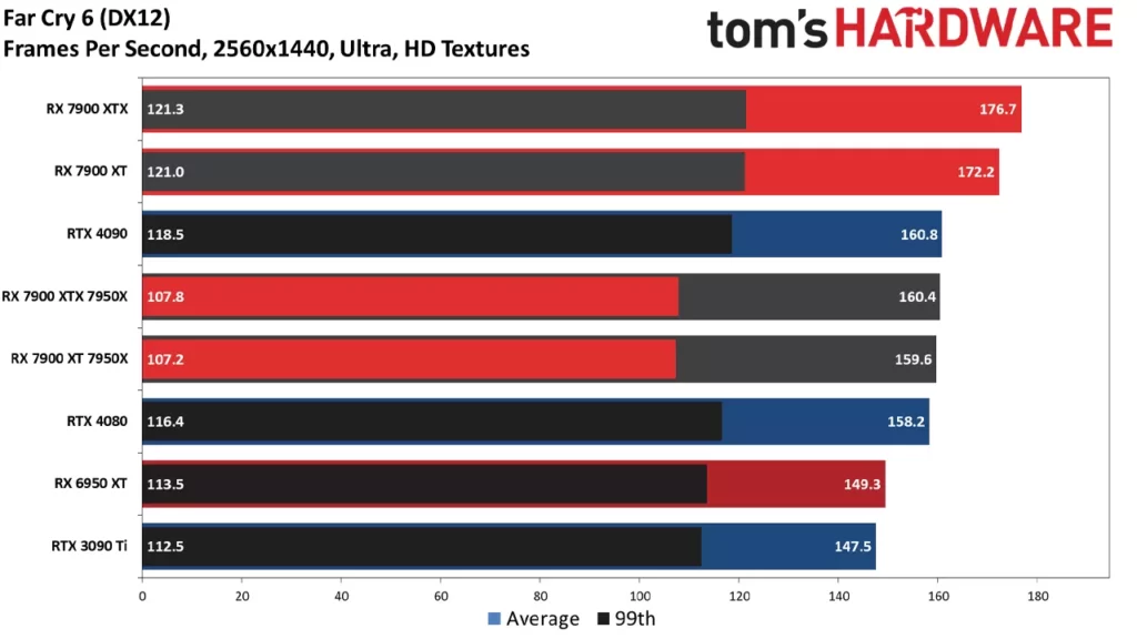 در رزولوشن 1440p کارت گرافیک RTX 4090 مقام اول رو به کارت گرافیکهای سری AMD RX 7900 میده، و ۹% کندتر از RX 7900 XT بوده. این مشکل احتمالا بخاطر رفتار موتور بازی Far Cry 6ه، چون دلیل دیگهای برای این برتری وجود نداره. حتی در استفاده از Ryzen 9 7950X در کنار RX 7900 XTX هم شاهد عملکرد ضعیفتری بودیم، پس به پردازنده هم مربوط نیست.