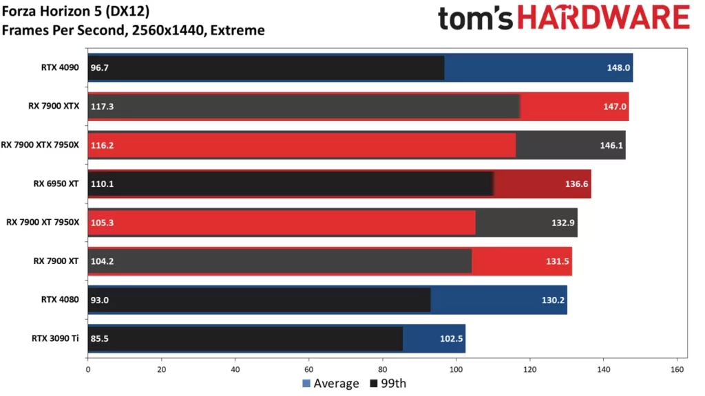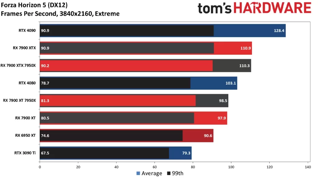 در بازی Forza Horizon 5 هم شاهد نتایجی مشابه با Far Cry 6 هستیم؛ در رزولوشن 4K کارت گرافیک RTX 4090 برتری ۱۵ درصدی نسبت به RX 7900 XTX داشته، اما در حداقل فریمها باز هم شاهد نتیجه بدتر با کارتهای انویدیا هستیم. هر دو کارت RTX 4090 و RX 7900 XTX حداقل فریم برابری رو به نمایش گذاشتن، ۹۱ فریم بر ثانیه، اما افت ۴۰ درصدی عملکرد بیشتر از افت ۲۱ درصدی مشهوده، و با اینکه RTX 4090 میانگین بهتری داشته، کارت RX 7900 XTX افت کوچکتری رو تجربه کرده.