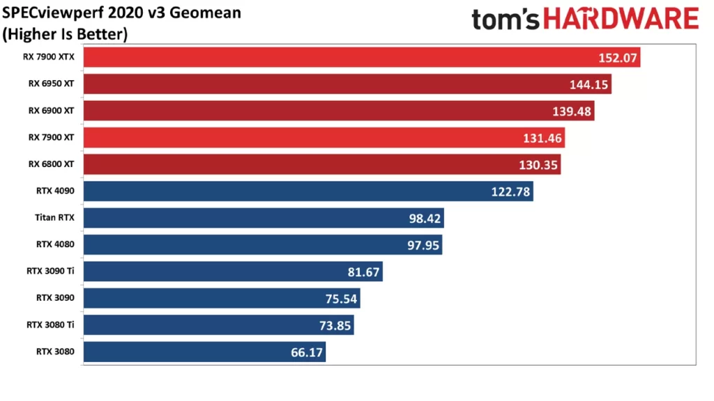 برای بررسی عملکرد حرفهای کارتها، از بنچمارک SPECviewperf استفاده شده که ۸ تست مختلف برای عملکرد کارت گرافیک داره. با یک نگاه به میانگین امتیازات، میبینیم که حتی ضعیفترین کارت گرافیک AMD حاضر در این لیست هم میتونه به راحتی RTX 4090 رو شکست بده! قطعا میپرسید چرا؟ خب باید بگم که این دو دلیل داره. اولیش آپدیت درایوریه که AMD پارسال برای کارتهاش منتشر کرد و باعث شد عملکرد کارت گرافیکهای سری ۶۰۰۰ و حالا ۷۰۰۰ در کارهای حرفهای بهتر بشه. دومیش هم محدودیتهای انویدیاست، یعنی انویدیا باعث شده که در این بنچمارک کارتش ضعیف باشه! انویدیا ابزارها و نرمافزارهای حرفهای زیادی داره، که ترجیح میده برای اجبار کاربران حرفهای مثل موسسات و سازمانها به خرید اونها، عملکرد کارت گرافیک رو در برخی کارها ضعیف کنه. مثلا محدودیت انکودهای همزمان کارت گرافیک. AMD از این کارها نمیکنه، و به کاربران اجازه میده بتونن شیره کارت رو بیرون بکشن.
