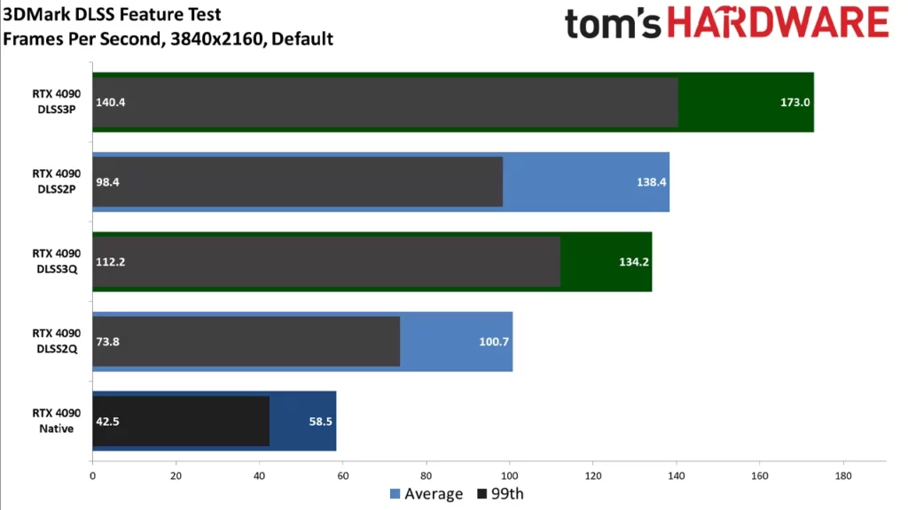 بررسی رو با تست 3DMark شروع میکنیم. همونطور که میبینید، کارت گرافیک RTX 4090 بدون استفاده از هیچکدوم از تکنولوژیهای آپسکیل تونسته ۵۸ فریم بر ثانیه به نمایش بذاره. با استفاده از فریم جنریشن در حالت DLSS 2 Quality، این عدد به ۱۳۴ فریم بر ثانیه افزایش پیدا میکنه، یعنی یه افزایش ۱۳۱ درصدی! اگه DLSS 2 رو روی حالت Performance بذاریم، این عدد به ۱۷۳ فریم بر ثانیه افزایش پیدا میکنه، چیزی حدود ۳ برابر قدرت خام RTX 4090!