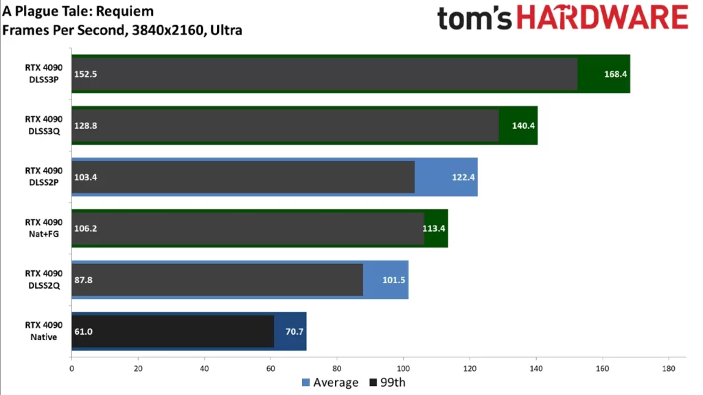 یه نگاهی هم به بازیها داشته باشیم. در بازی A Plague Tale: Requiem، کارت گرافیک RTX 4090 در حالت عادی تونسته ۷۰ فریم بر ثانیه به نمایش بذاره. با استفاده از تنها DLSS 2 Quality، این عدد به ۱۰۱ فریم بر ثانیه افزایش پیدا میکنه. اگه از فریم جنریشن هم به تنهایی استفاده کنیم، این عدد به ۱۱۳ فریم بر ثانیه میرسه، ۶۱% بیشتر از حالت عادی. اگه DLSS 2 Performance و فریم جنریشن رو در این بازی فعال کنیم، به عدد ۱۶۸ فریم بر ثانیه میرسیم، ۱۴۰% بیشتر از قدرت خام کارت گرافیک RTX 4090.