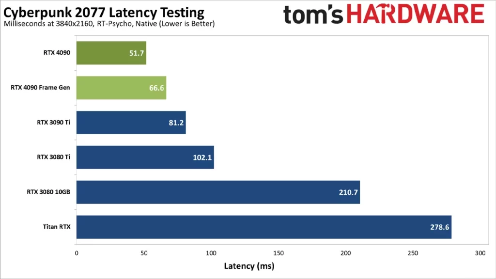 DLSS 3 همونطور که دیدیم میتونه فریم ریت رو بالا ببره، منتها DLSS 2 هم بخش زیادی از همین کار رو با مشکلات کمتر انجام میده. اگه انویدیا به جای معرفی یک تکنولوژی جدید که تنها تعداد انگشتشماری از کارت گرافیکهاش میتونن از اون استفاده کنن، روی بهتر کردن DLSS کار میکرد، الان قطعا شاهد همین پیشرفتها بدون تاخیر و مشکلات دیگه فریم جنریشن بودیم. مشکلات تصویری این تکنولوژی رو همونطور که گفتم نمیتونیم بهتون نشون بدیم، اما میتونیم تست تاخیرش رو ببینیم.