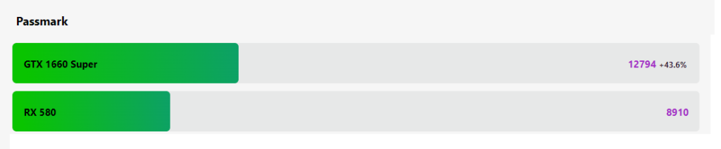 برای مثال، بنچمارک Passmark کارتها رو به حداکثر حالت نسخههای مختلف نرمافزار Direct3D میبره و با رزولوشنهای بسیار بالا، تست میکنه. در اینجا، Nvidia GeForce GTX 1660 Super عملکرد AMD Radeon RX 580 رو با تفاوت ۴۳.۳% پشت سر میذاره.