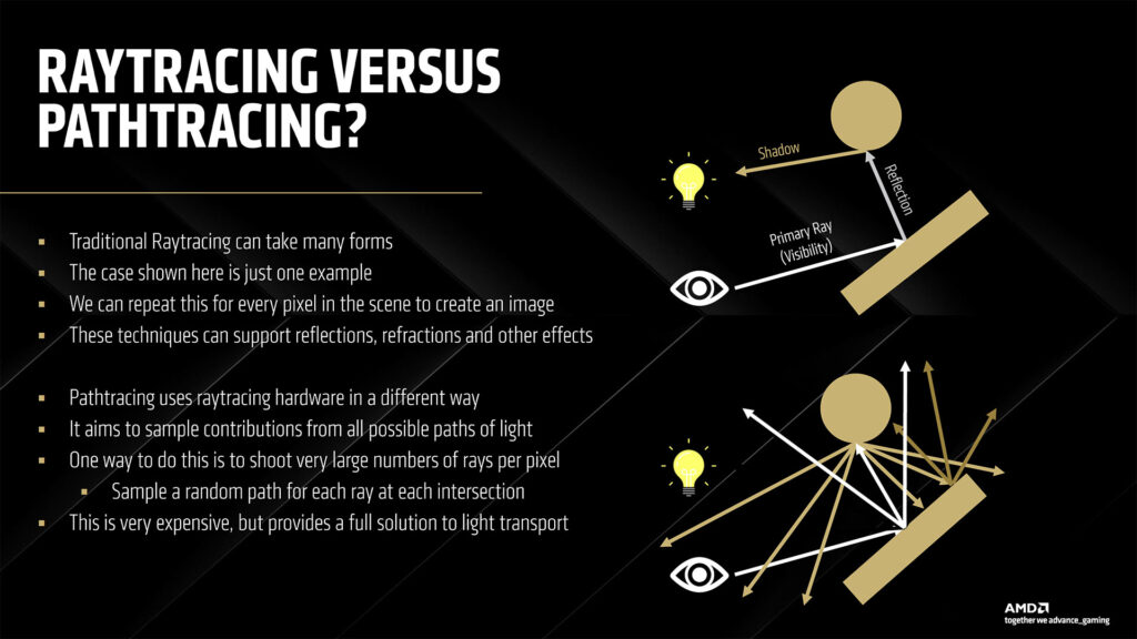 سری RX 9000 انویدیا از Path Tracing هم پشتیبانی میکنن. Path Tracing یک الگوریتم مبتنی بر ری تریسینگه که به دقت بازتابهای نور داخل تصویر رو پردازش میکنه و یه شبیهسازی بسیار واقع بینانه از تصویر ایجاد میکنه. اولین بار انویدیا در سری ۴۰ از این پروسه استفاده کرد، اما حالا AMD هم با سری RX 9000 میتونه این پردازشها رو انجام بده.