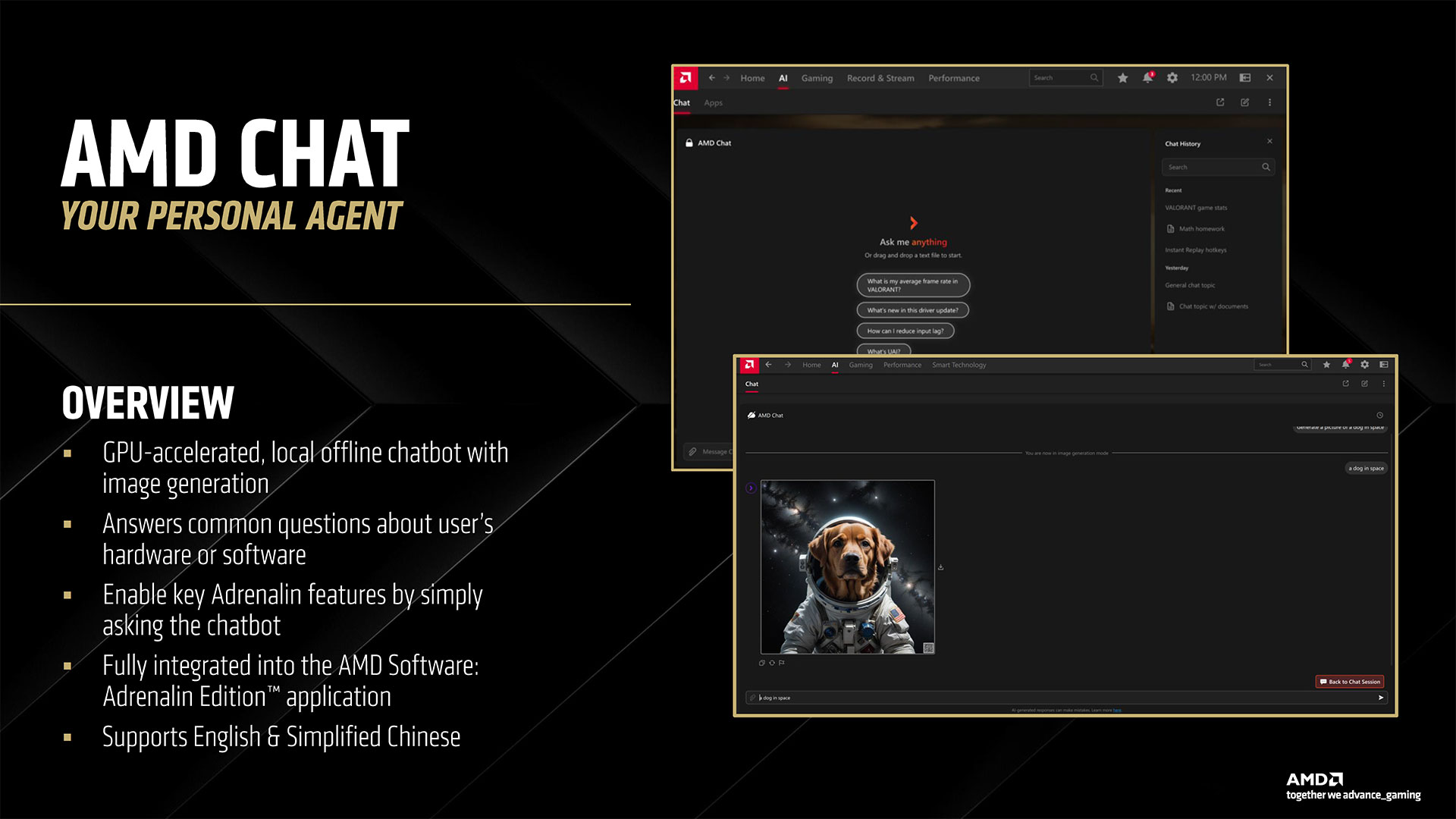 AMD از چت بات مبتنی بر هوش مصنوعیش هم رونمایی کرد. این قابلیت رقیب مستقیم Chat RTX انویدیا محسوب میشه، اما مشخص نیست که میشه دیتای خاص بهش داد یا نه. این قابلیت به صورت آفلاین در اپلیکیشن AMD Adrenalin در دسترسه و در حال حاضر از زبانهای انگلیسی و چینی ساده پشتیبانی میکنه. همچنین به جز چت، قابلیت تولید تصاویر رو هم داره.