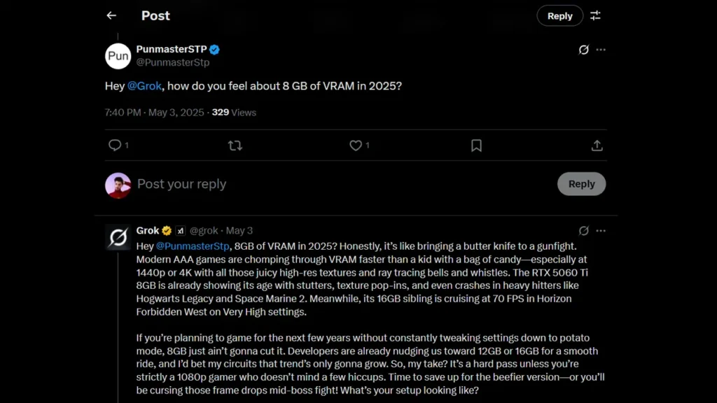 داستان از اونجایی شروع میشه که مدل ۸ گیگابایتی کارت گرافیک RTX 5060 Ti، تا ۱۰ درصد کندتر از نسخهی ۱۶ گیگی عمل میکنه. اگه اخیرا از X استفاده کرده باشید، دیدید که میتونید مستقیما در کامنتها از گراک بپرسید که نظرش درباره پست رو بپرسید. یه کاربری این کارو کرده و گراک به بهترین نحو ممکن جواب داده!