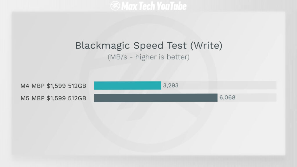این تستها از چنل Max Tech میاد که مقایسه کاملی بین MBP M4 و MBP M5 منتشر کرده. توی تست Blackmagic Disk Speed Test، مکبوک پرو M5 به سرعت خواندن ۶۳۲۳ مگابایت بر ثانیه رسید. درحالیکه مدل M4 فقط ۲۰۳۱ مگابایت بر ثانیه سرعت داشت! یعنی چی؟ یعنی SSD مدل جدید بیش از ۳ برابر سریعتره. M4 خودش کند نیست، ولی فاصله واقعاً زیاد شده.