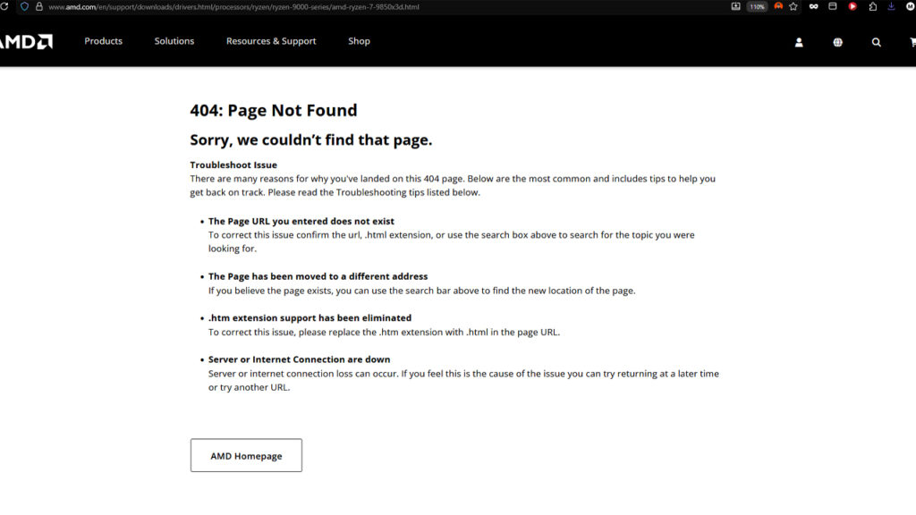 AMD این صفحه رو از سایتش حذف کرده، اما URL اون که رتبه گرفته در گوگل مشهوده. با این حال وقتی روش کلیک کنید با ارور ۴۰۴ مواجه می‌شید.