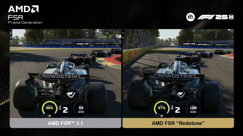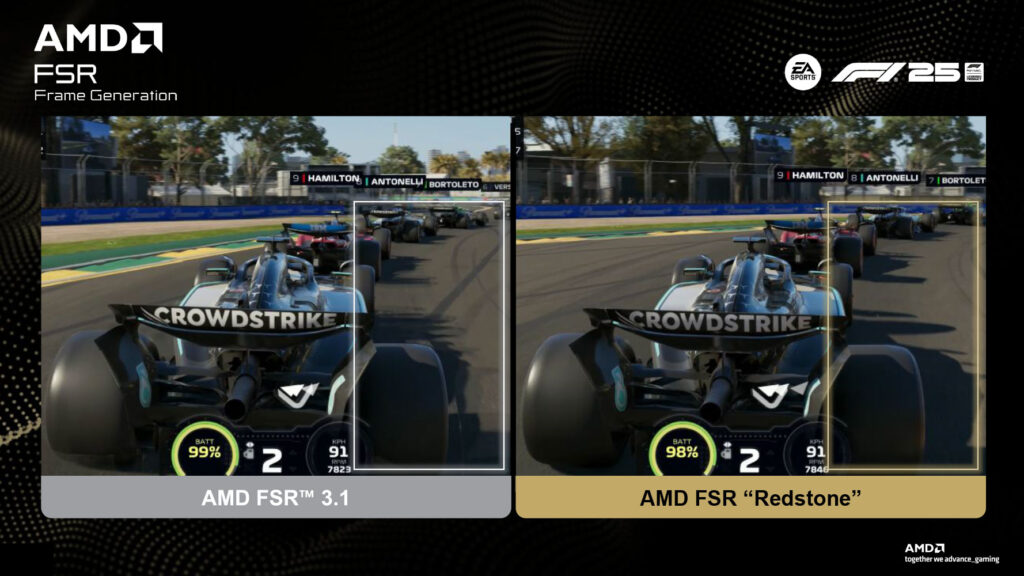 AMD میگه این سیستم با یک شبکه عصبی آموزشدیده ساخته شده تا فریمریت بالا، روان و بدون مشکلات تصویری ارائه بده. همچنین قراره مشکلات سایهزنی و آرتیفکتهای زمانی (temporal artifacts) رو کاهش بده—چیزی که AMD نمونههاش رو در اسلایدهای F1 25 نشون داد.